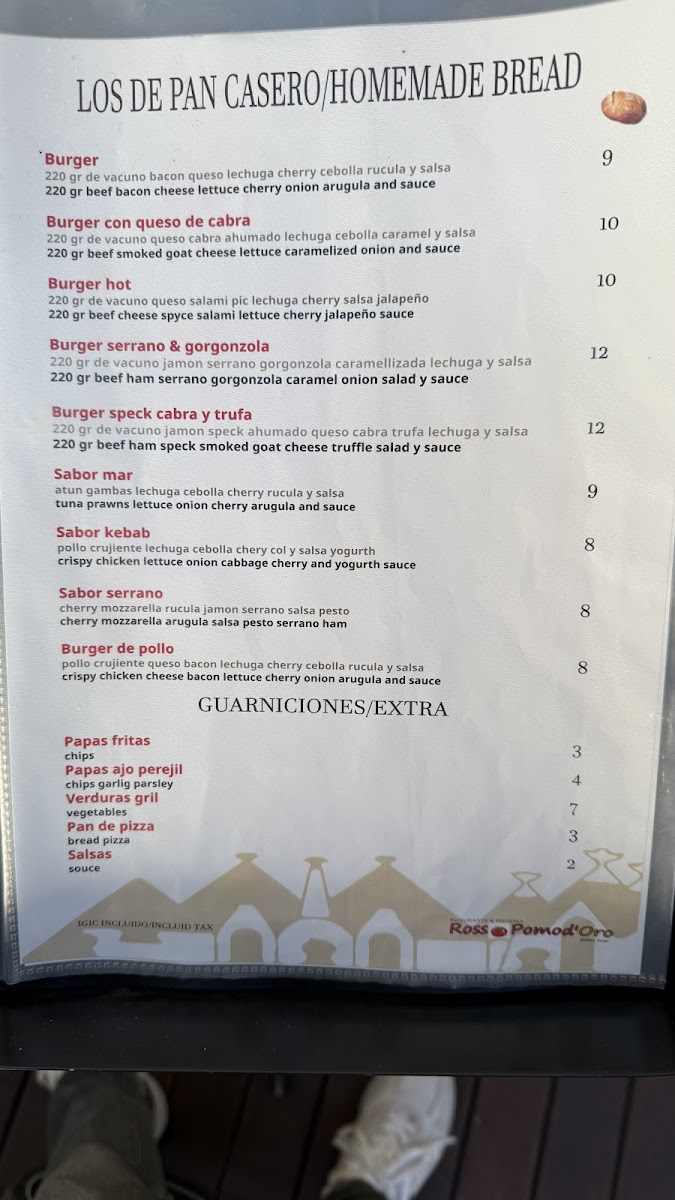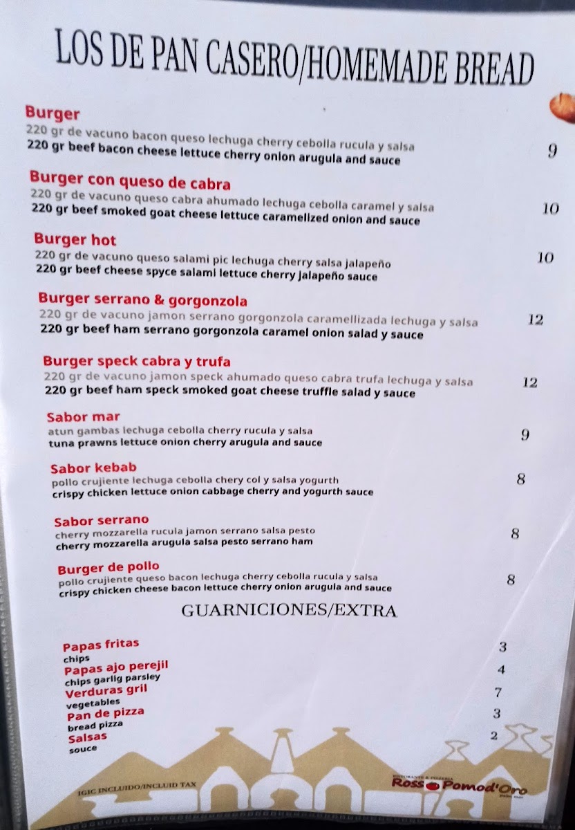 The menu at Rosso Pomod'oro 'el Palm Mar' offers a delightful variety of dishes that showcase the flavors of Italian cuisine with a touch of innovation. One of the standout options is the Fast Burger, a quick yet satisfying choice for burger lovers, while the Burger Con Queso de Cabra elevates the classic with a rich goat cheese topping. For those craving something sweet, the Tiramisu is a must-try, a creamy and indulgent dessert that perfectly caps off a meal.